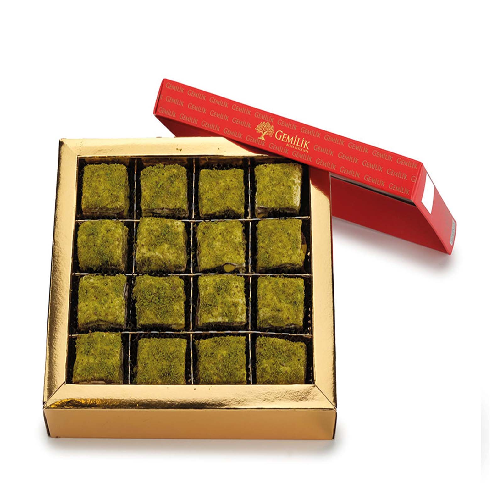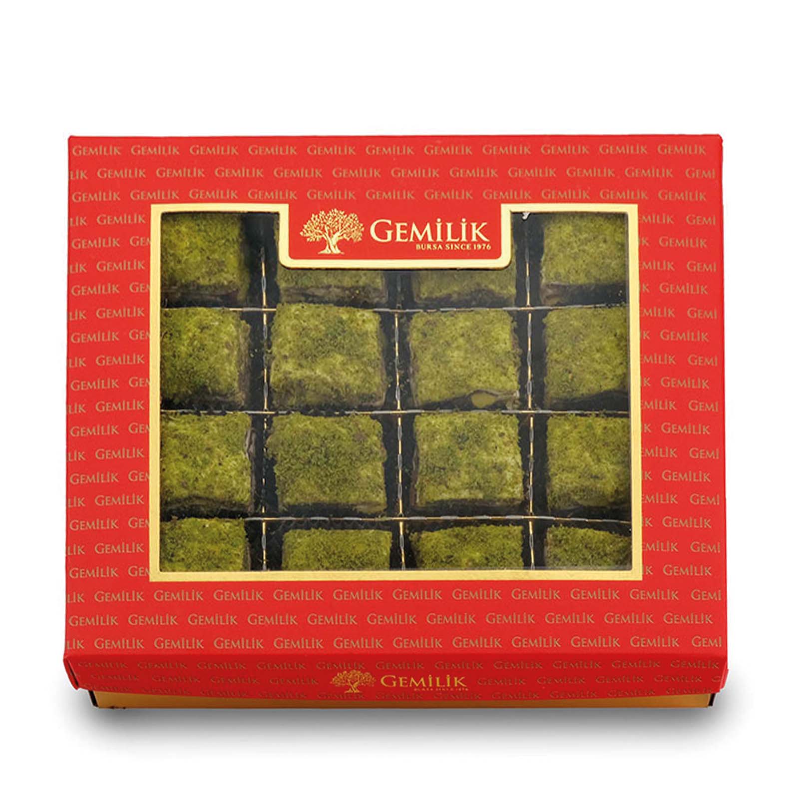 Yoğun Antep fıstığı kaplamasıyla hazırlanan Gemilik Katmer Lokum. Geleneksel lezzet, özel sunum.